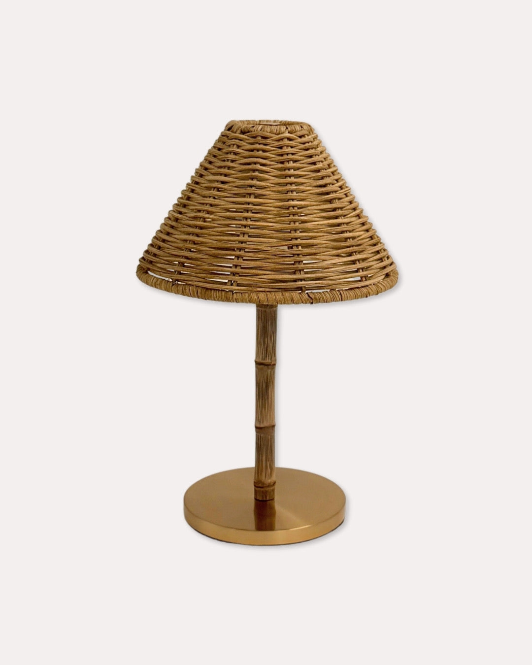 The JUNO BEACH rechargeable and portable table lamp features a bamboo and gold-coated base, complemented by a rattan shade.