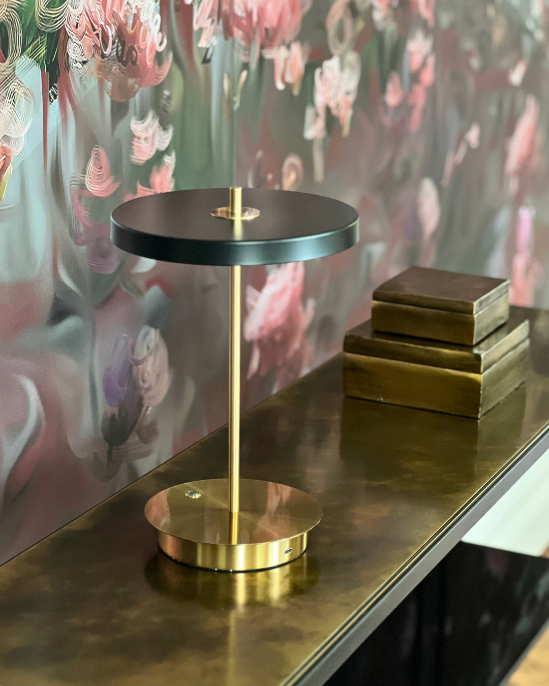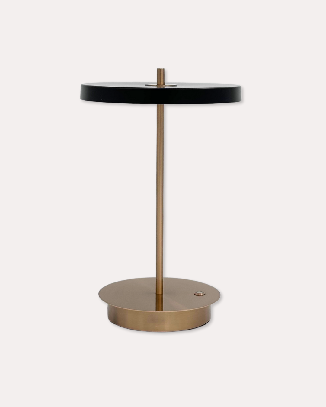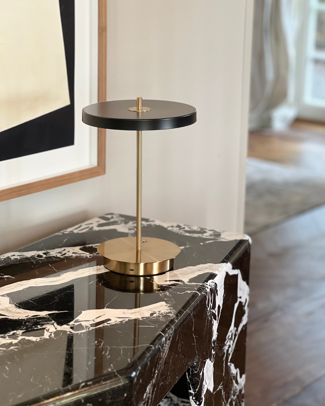 The PORTO rechargeable and portable table lamp features a matte black finish on the shade and brass coating on the stand, giving it a contemporary presence. With a solid weight, dimmable light, and clean lines it is the perfect addition to any side, coffee, or console table.