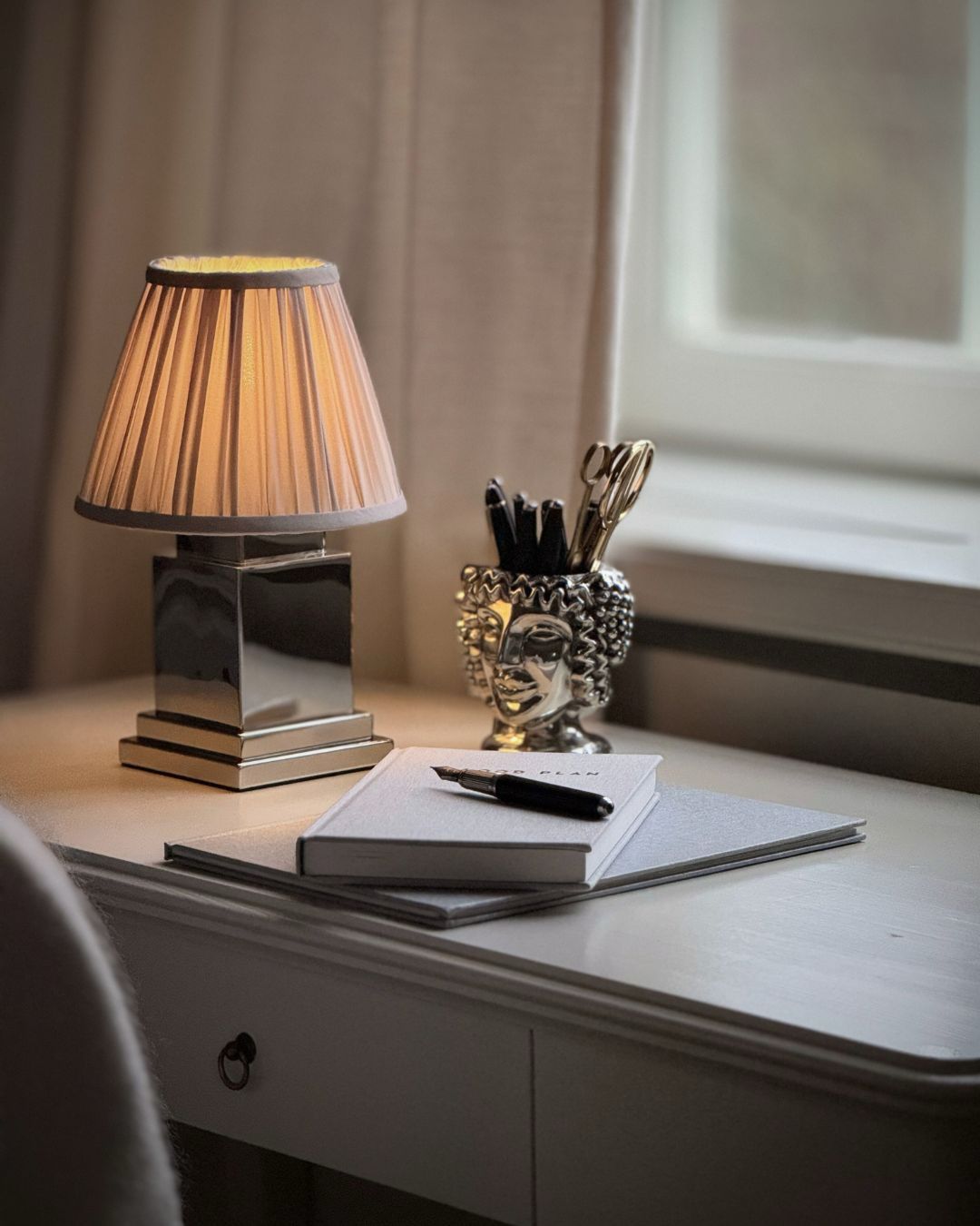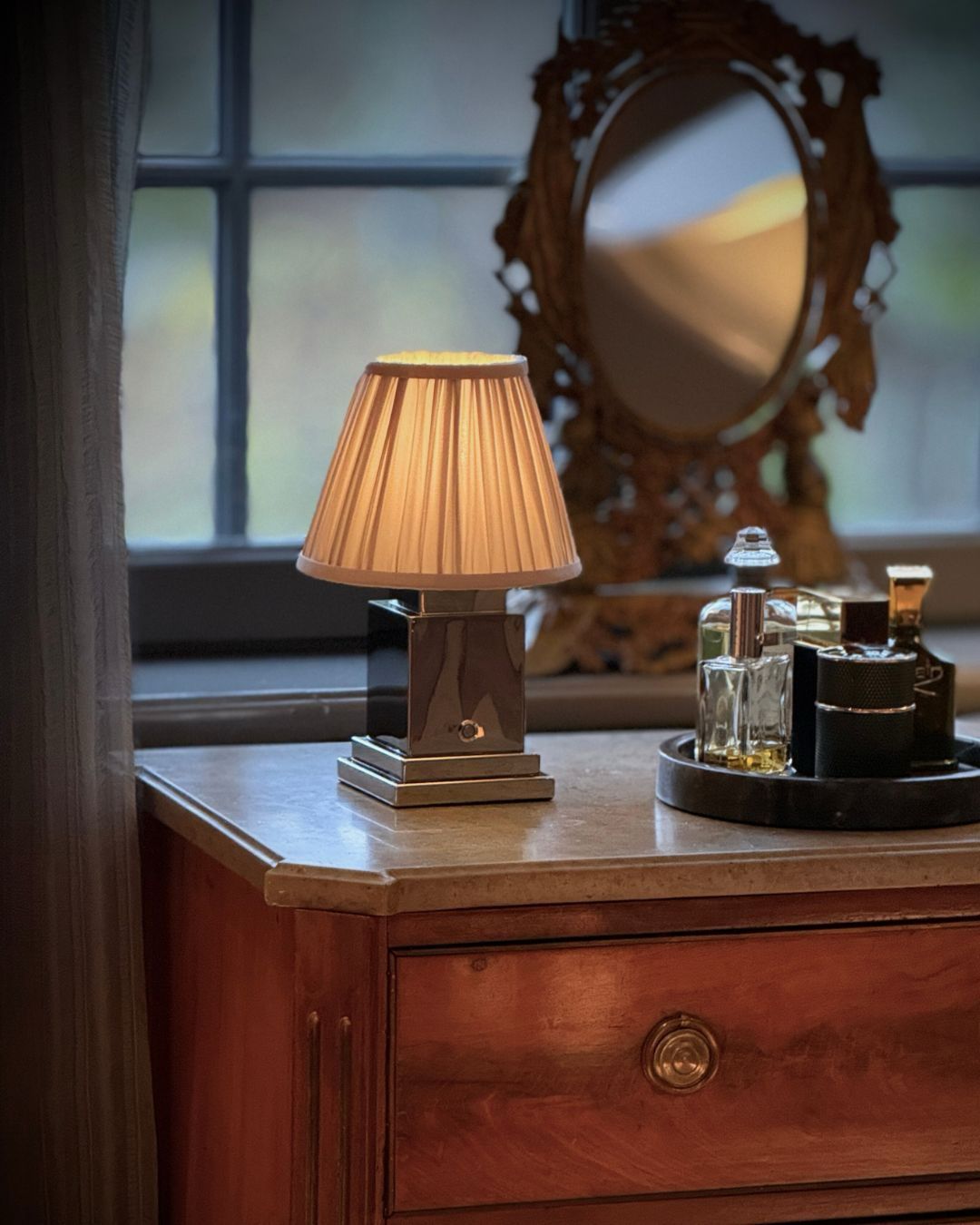 The PIMLICO rechargeable and portable table lamp features a shiny and luxurious chrome finish, complemented by a Clouded Whisper pleated shade. With a solid weight and dimmable light, this lamp is the perfect addition to any dinner setting or side table. Place it on a windowsill or in a guest bathroom - the possibilities are endless!